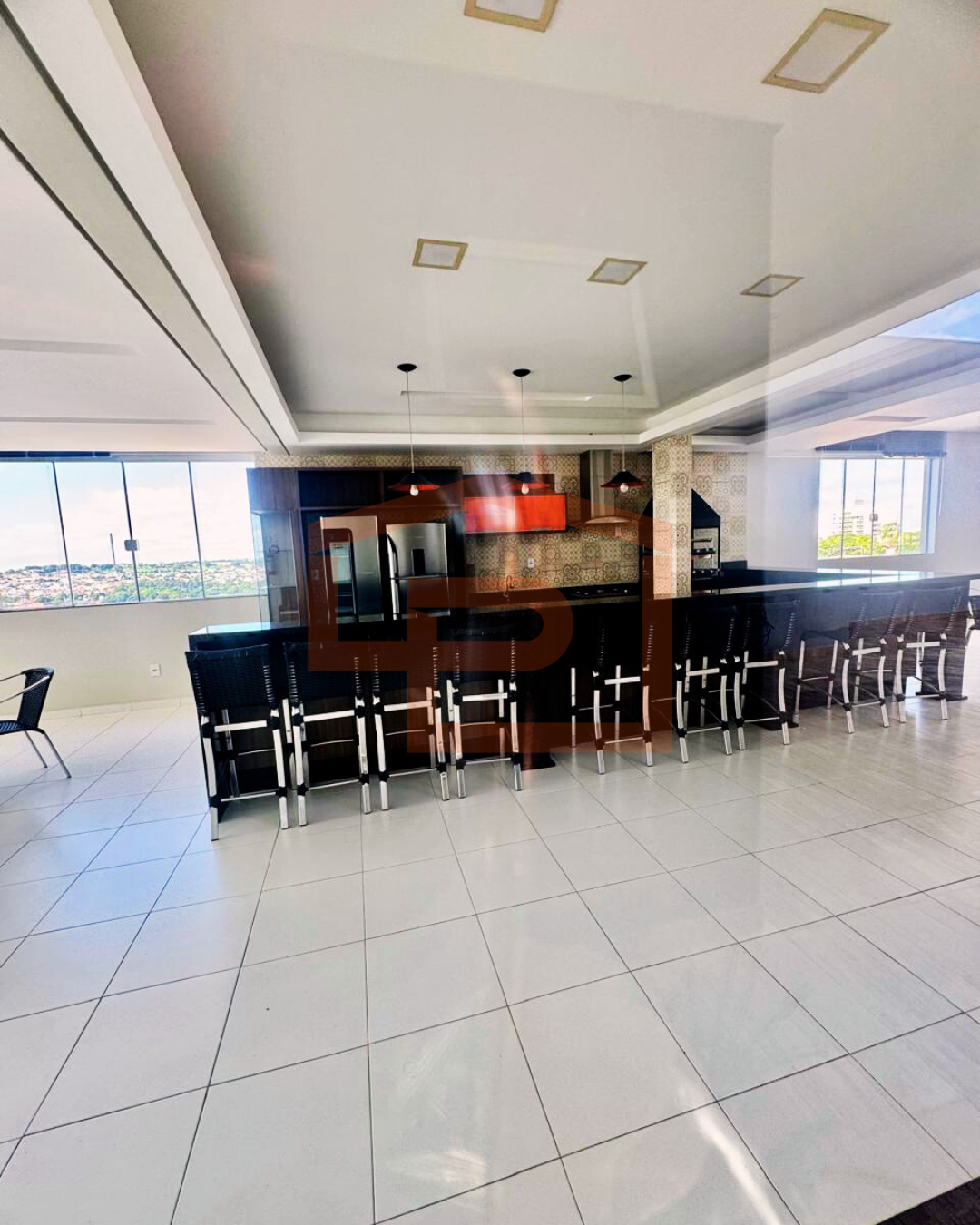 * cozinha e área gourmet com pé direito alto
