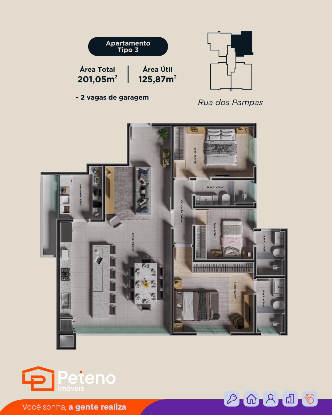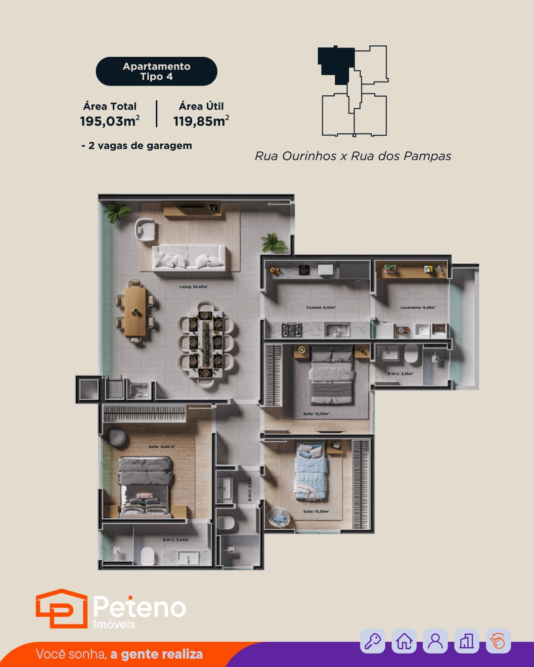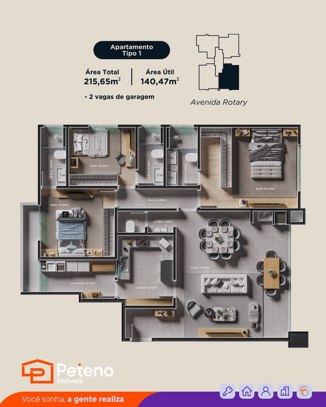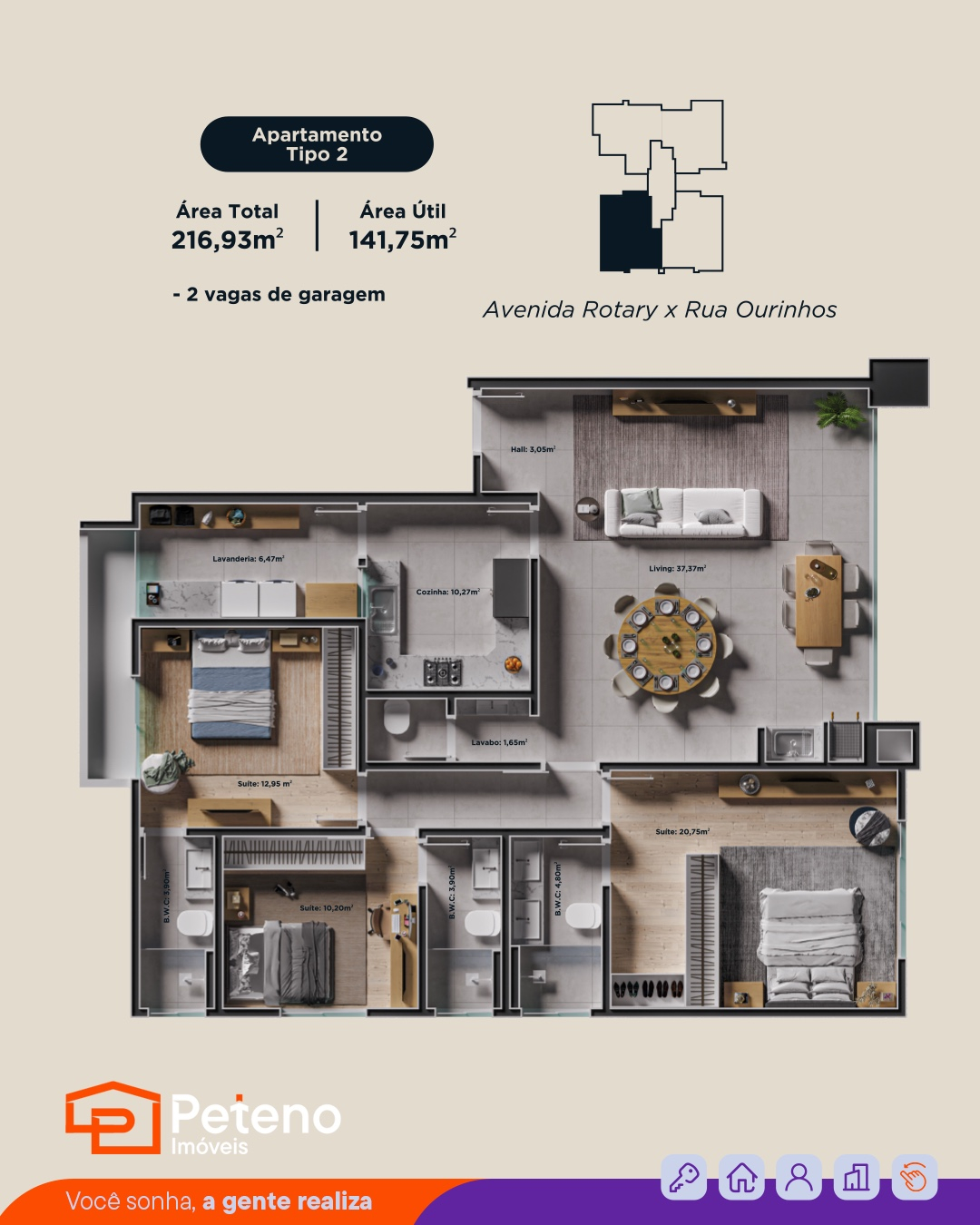 Com plantas de 195,03 m² à 216,93 m² de área total;